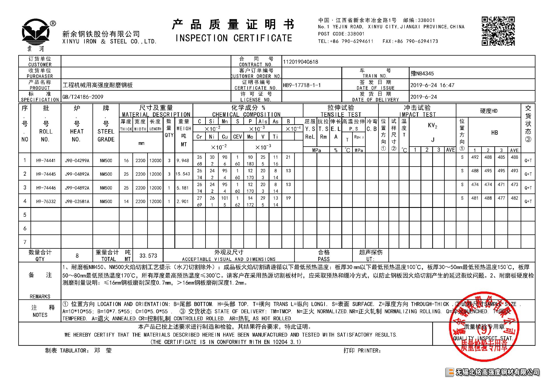 我司常備品種有NM360/NM400/NM450/NM500 規格范圍:3MM-100MM。部分規格可切割零售。主要產地為:興澄、新鋼、漣鋼