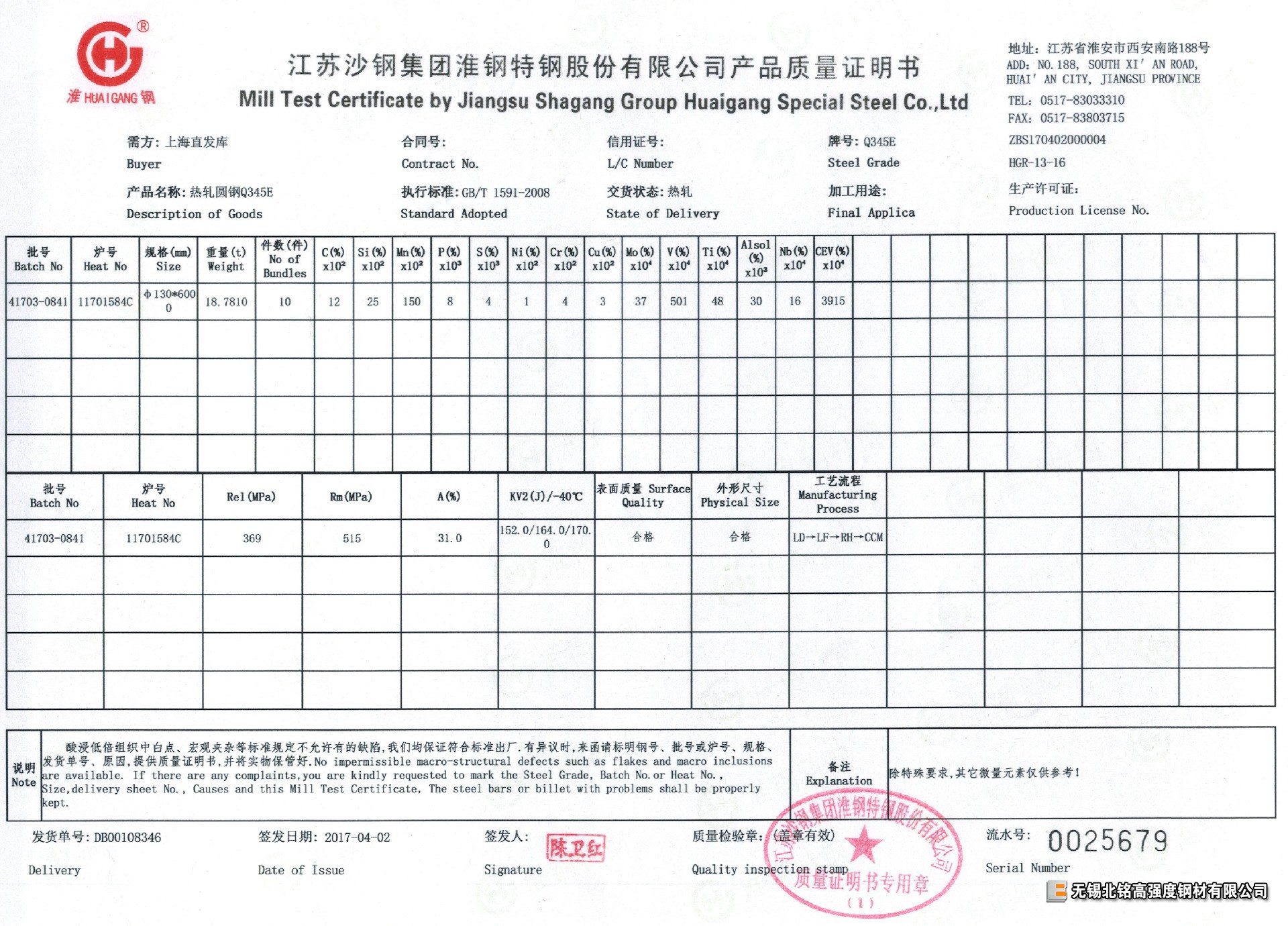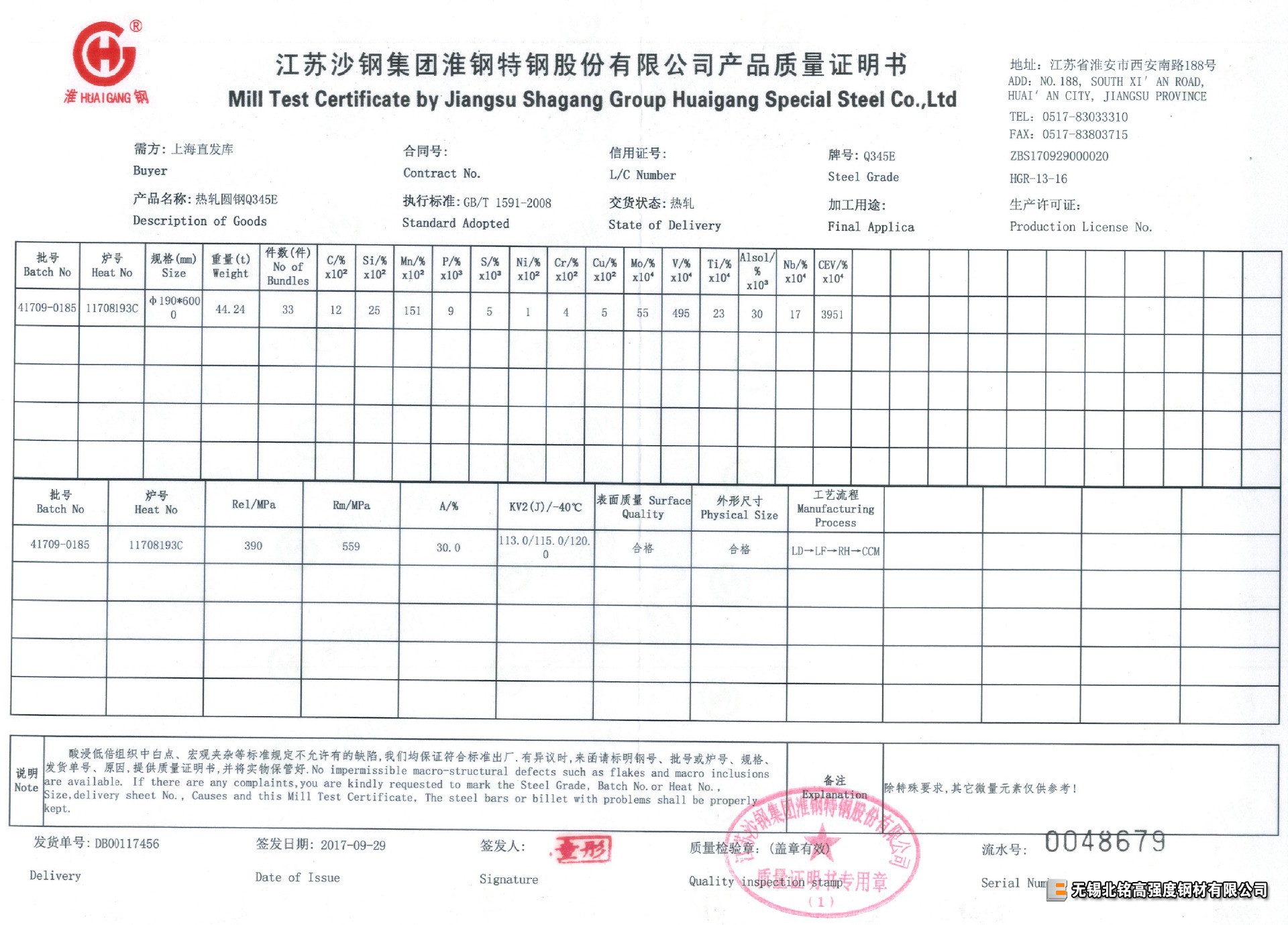 每支材料均有對應(yīng)爐批號鋼廠質(zhì)量證明書(質(zhì)保書),保證-20℃、-40℃ 低溫沖擊功值合格。