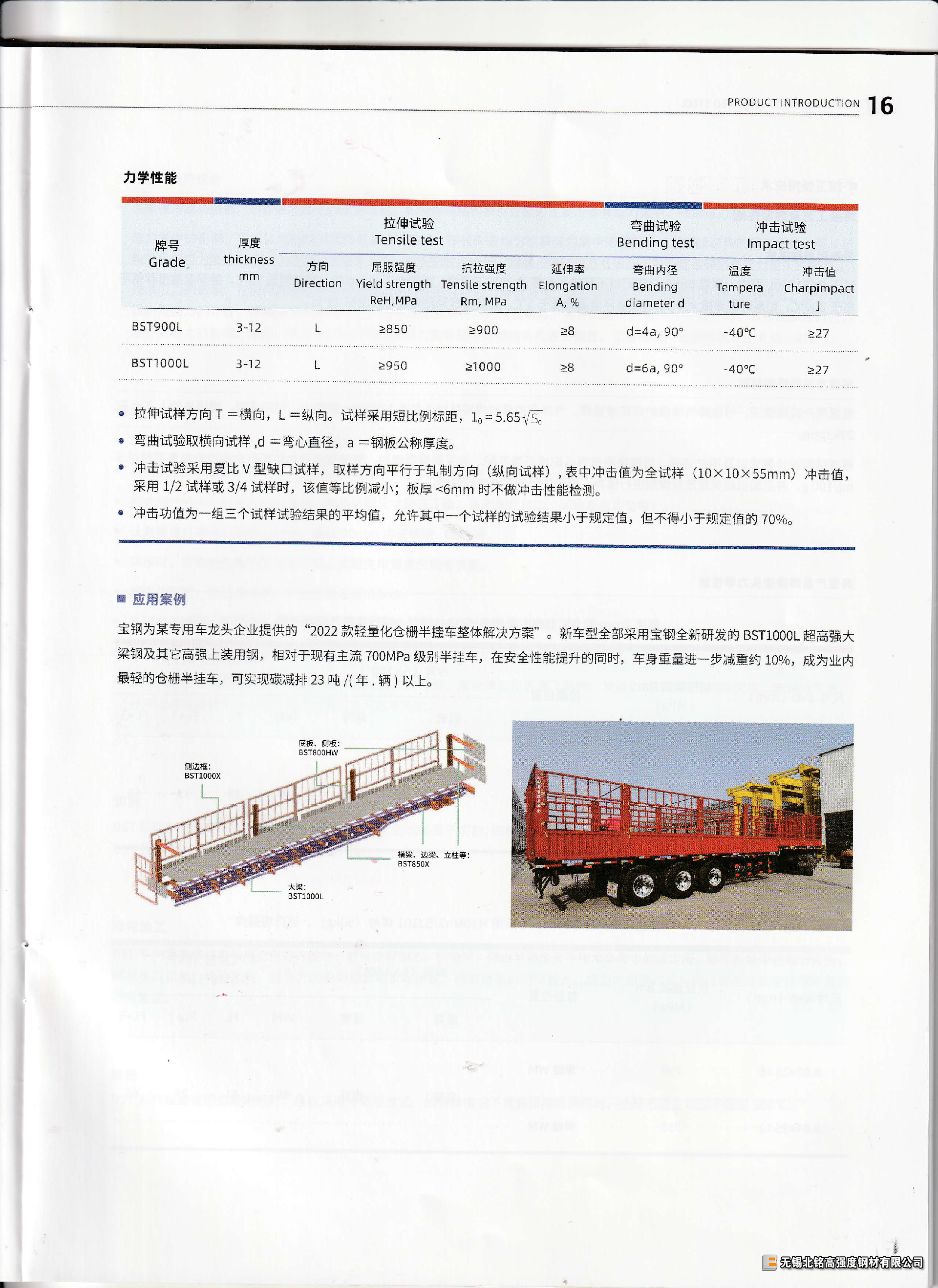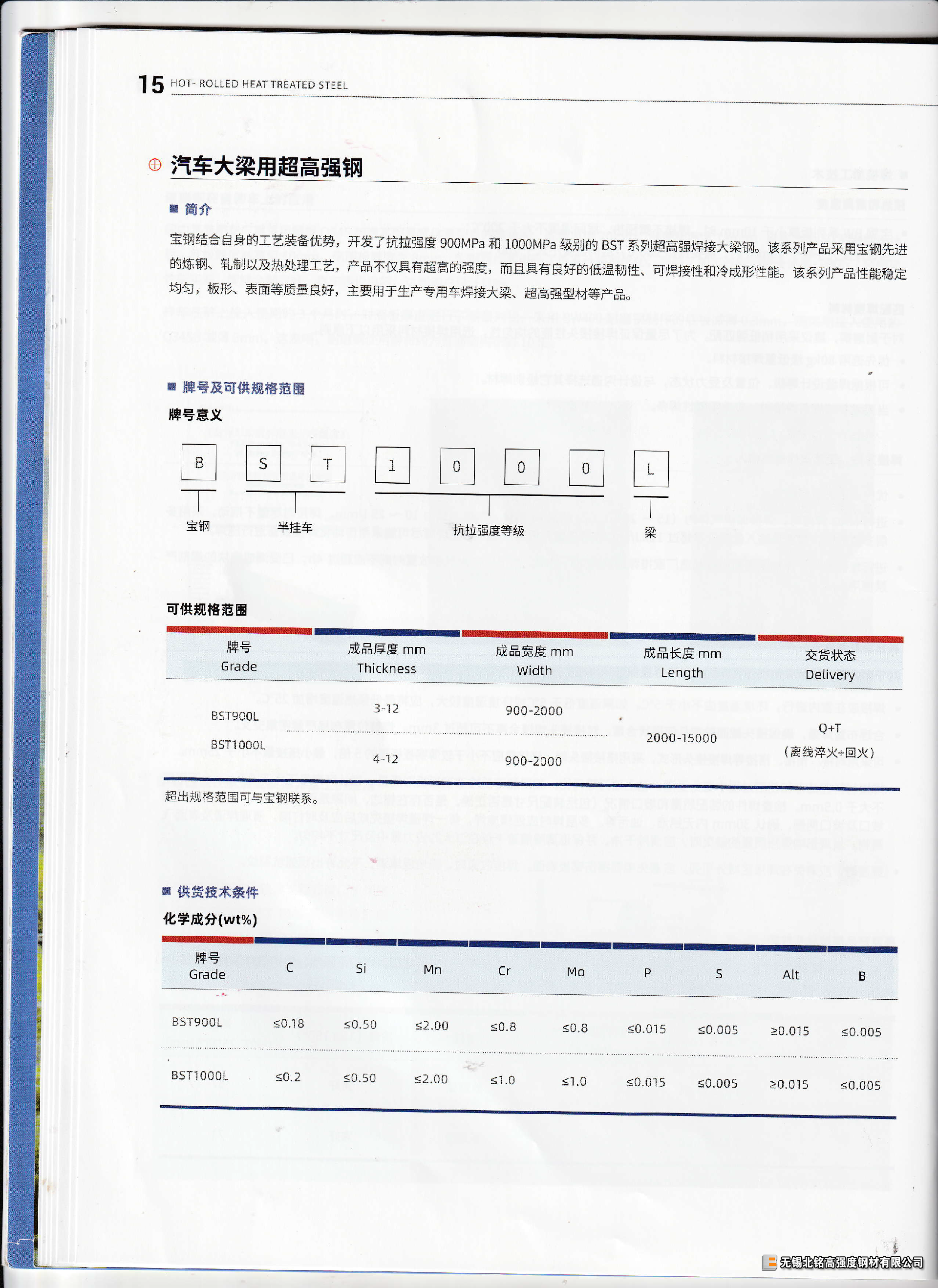 高強度鋼Q550D,Q690D,工程機械高強鋼BS650MCK2(MCJ4),BS700MCK2(MCJ4),BS700MCK4,BS800D/E,BS900D/E,BS960D/E,BS1000D/E,BS1300D/E, 高猛耐磨板鋼MN13,耐低溫耐磨鋼NM400E,NM450E,NM500E,NM600,BMS1000,BMS1200,BMS1400,BST900L,BST1000L, 防彈鋼BP300(B900FD),BP440,BP500T,BP600,超強磁軛鋼Wder800,Wder900,Wder1000,Wder1100。