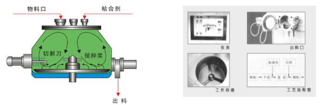 粉體物料與粘合劑在圓筒形容器中由底部混合漿充分混合成濕潤材料,然后由側(cè)置的高速粉碎槳切割成均勻的濕顆粒。制粒時間短。主藥與輔料差異大時,仍能達到均勻結(jié)合,無分層現(xiàn)象。